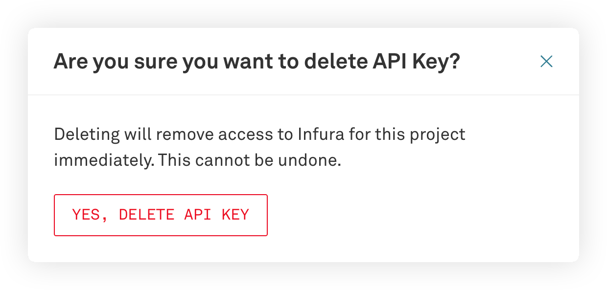 Say you're no longer using one of your Infura API keys, or one of your API keys accidentally got published on a public code repository; no worries, you can easily delete your existing key and set up a new one.