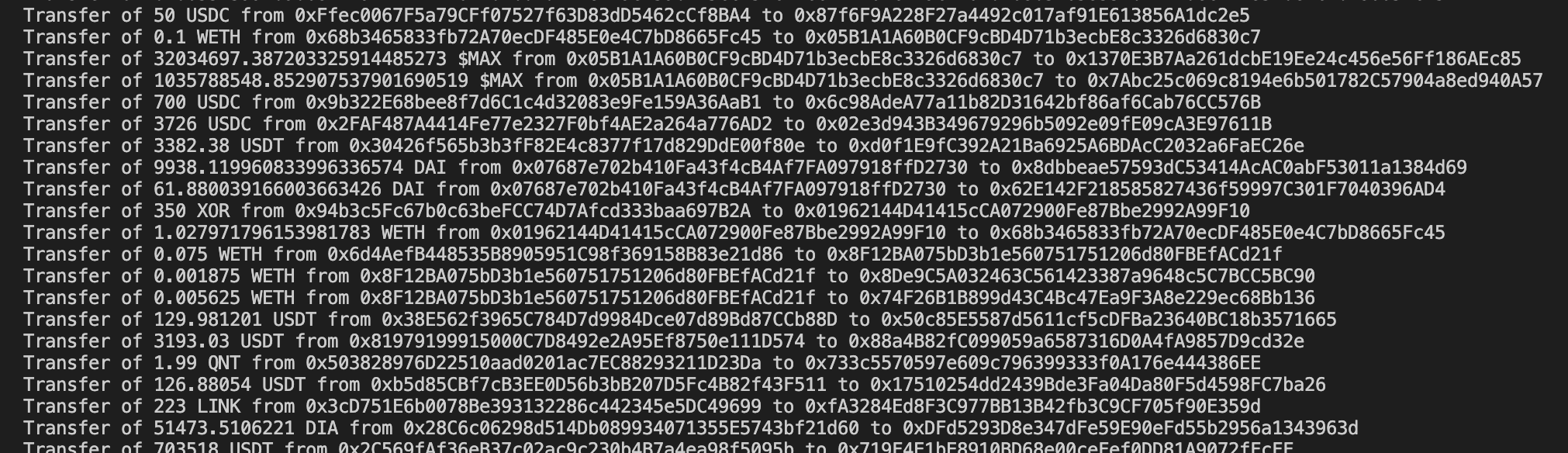 Then, inside the listener, let’s call the collectData function every time a new ERC-20 transaction is found. Additionally, we also calculate the correct decimal value: